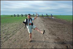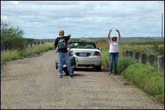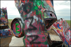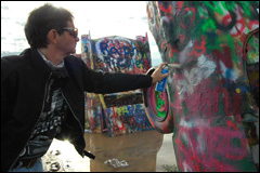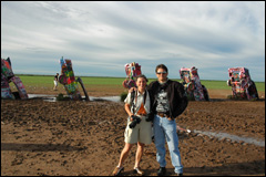 Cadillac Ranch, quelques miles après Amarillo; 10 Cadillacs plantées dans le terrain cela nous inspire et l'on se lance dans cet endroit boueux. On s'en donne à cœur joie pour sprayer (matériel à disposition sur place!) et placer un autocollant RMN. Chaque année ces voitures sont entièrement repeintes. Nous avons hésité à laisser nos souliers, comme d'autres, accrochés à la barrière, mais finalement non, nous en avons encore besoin. Autant dire que pour la journée mieux vaut en changer. On constate qu'en toutes circonstances Pierrot est toujours galant avec les dames!! |