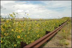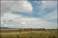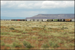 Les vastes étendues du Nouveau-Mexique, zébrées par la route et le chemin de fer. La plupart du temps les trains font plus de 1,5 km de long! |