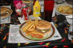 A Grants, au Grants Café nous n'avons pu nous empêcher de goûter la spécialité, le cheeseburger au piment vert. Le seul burger du séjour mais absolument délicieux. La taille des frites vaut aussi le détour. La nappe est trompeuse, ce n'était vraiment pas fort. |