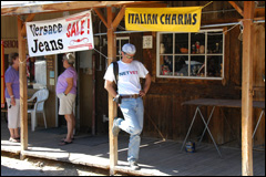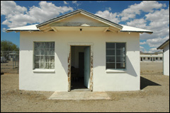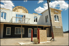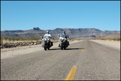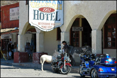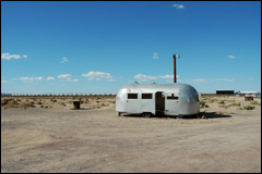 A Amboy, le Roy's Café, un des plus beaux motels de la Route 66, le cadre grandiose du désert, les couleurs pastels et la chaleur, 42° sans ombre! La station d'essence parait fonctionnelle, mais force est de constater qu'elle est pourtant fermée depuis pas mal de temps. Carole, une française qui organise des voyages à moto, nous offre très gentiment de l'essence pour être sûr d'arriver jusqu'à la prochaine pompe. Finalement, nous en étions assez proche et nous aurions eu assez de carburant. Merci à ces motards sympas. |